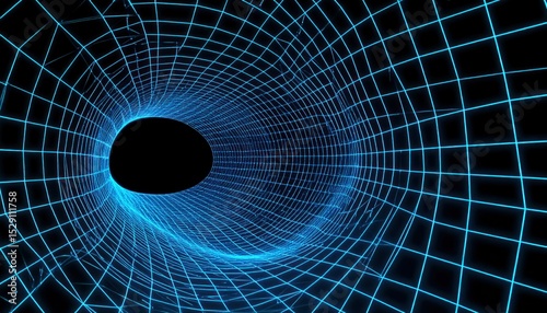 Fototapeta premium Abstract 3D Tunnel Structure With Glowing Blue Grid Lines And Central Black Void Space