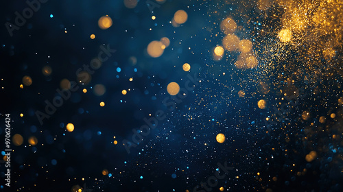 © Uwe, Obraz premium abstract dark bleu background with gold particles, Christmas or new year background