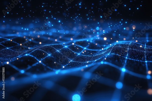 Obraz premium Abstract dark blue background, sparkling blue light particles, deep depth of field, particles forming lines, surfaces, grids