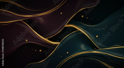 Obraz premium Abstract Dark Elegance: Intertwined Waves of Deep Purple and Teal, Accented with Golden Lines and Shimmering Particles