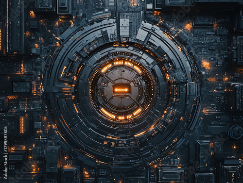Fototapeta premium Abstract dark technology background with glowing circles and patterns.