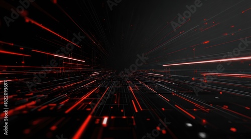 Fototapeta premium Abstract dark tunnel with glowing red light streaks moving fast