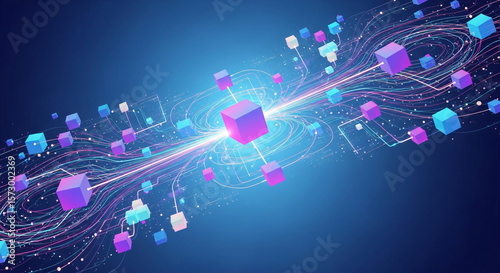 © W.O.W, Naklejka premium Abstract data connection with colorful cubes and light streams. Blockchain technology and network communication concept for web.