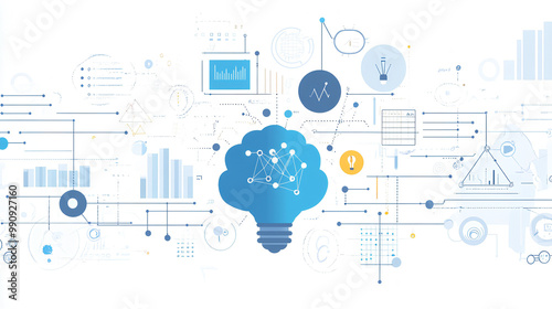 Fototapeta premium Abstract data elements like charts, graphs, and binary code flowing around a central brain or lightbulb symbol, representing analytics and innovation