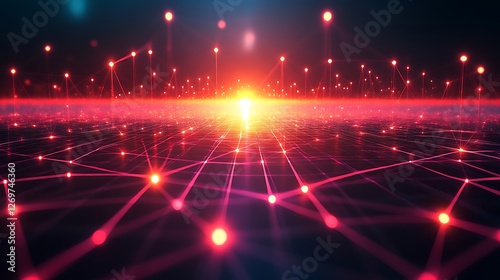 Obraz premium Abstract Data Network Landscape with Glowing Nodes and Interconnected Lines
