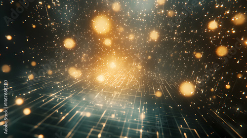© KunFhayakun, Obraz premium Abstract data stream visualization with gold particles and glowing grid lines
