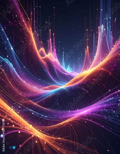 © Behh, Obraz premium Abstract Data Stream Visualization with Vibrant Colors and Particles.