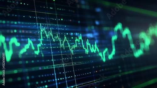 © Tackey, Fototapeta premium Abstract Data Visualization with Green Line Graph on Blue Background for Financial and Technology Themes