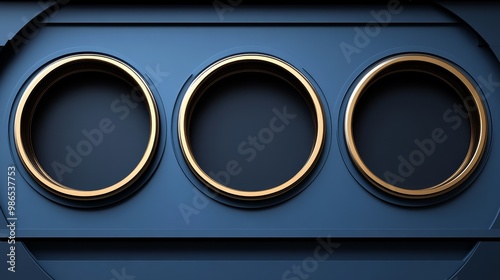 Fototapeta premium Abstract design featuring three circular elements with gold trim on a deep blue backdrop, ideal for modern decor or backgrounds.