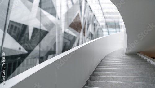 Fototapeta premium Abstract design featuring white spiral stairs with a perspective view and railing