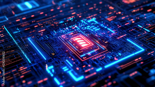 Obraz premium Abstract digital AI technology matrix with complex algorithms and neon-like...