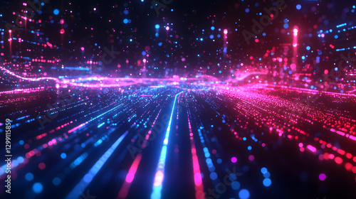 © Silmiart, Obraz premium Abstract digital art depicting a futuristic, glowing landscape with pink and blue particles and lines. Ideal for tech, AI, or data visualization projects.