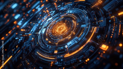 Fototapeta premium Abstract Digital Art: Glowing Orange and Blue Circular Pattern