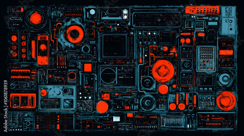 © Nadiyah, Obraz premium Abstract digital art of a futuristic control panel with red and blue lights.