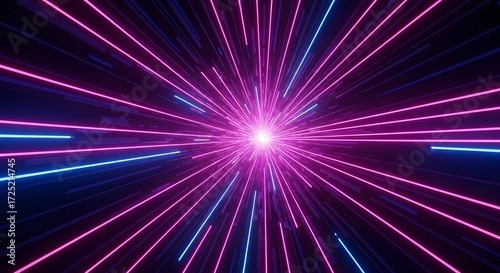 © Ade, Naklejka premium Abstract digital art of pink and blue neon light beams radiating outward from a bright central point, creating a sense of high-speed travel.
