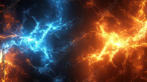 Obraz premium Abstract digital art with blue and orange lightning streaks on black background