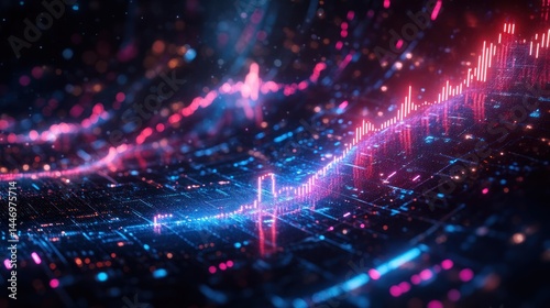 © ngalong project, Fototapeta premium Abstract digital art with blue and red glowing lines and dots on black.