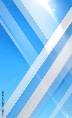 Obraz premium Abstract digital artwork featuring translucent, diagonally intersecting light-blue and white stripes against a bright-blue sky background; sun glare effect