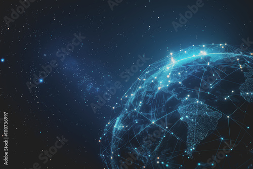 © PHAISITSAWAN, Obraz premium Abstract digital background with a blue gradient and glowing planets with connecting dots.