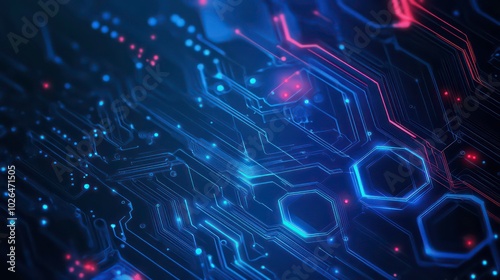 © sablengjago, Obraz premium Abstract digital background with glowing blue and red circuit board lines and hexagons on a dark background.