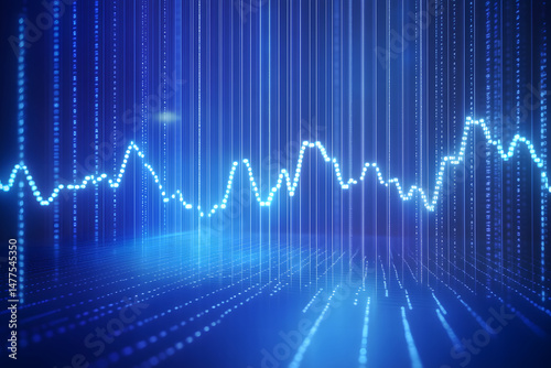 © Daniel, Naklejka premium Abstract digital background with glowing light graphs and binary code over blue gradient bars representing data analysis and financial growth.