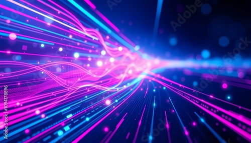 Naklejka premium Abstract digital background with glowing lines and particles in blue and pink.