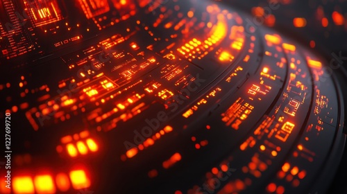 © A4719, Obraz premium Abstract digital background with glowing orange circuits and lines, dark background, close up view, technological theme, futuristic design, high