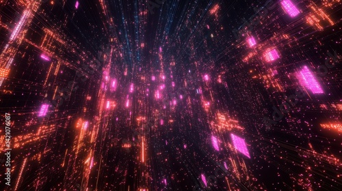 Fototapeta premium Abstract digital background with glowing pink and orange data streams. Use to illustrate concepts like data processing, AI, or technology of future.