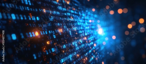 © MBRAMO, Naklejka premium Abstract digital binary code background with glowing blue and orange lights.
