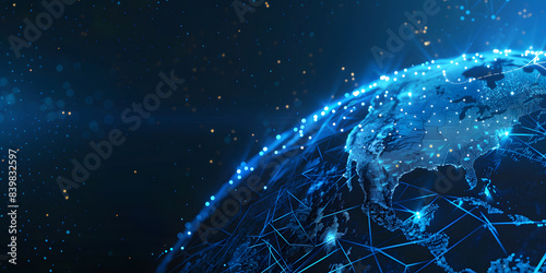 Obraz premium Abstract digital blue earth with glowing dots on black background, technology...