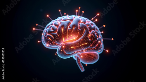 Fototapeta premium Abstract digital brain visualization, vibrant neural connections and glowing nodes, emphasizes cognitive processes and innovation.