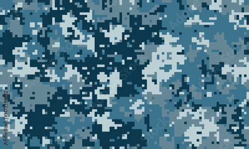 Fototapeta premium Abstract digital camouflage pattern in cool blue tones. Perfect for backgrounds, textiles, or militarythemed designs. Seamless repeat texture offers versatility for various creative projects.