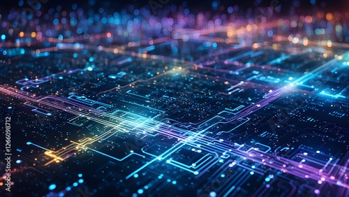 Obraz premium Abstract digital circuit board with glowing lines and bokeh city background.