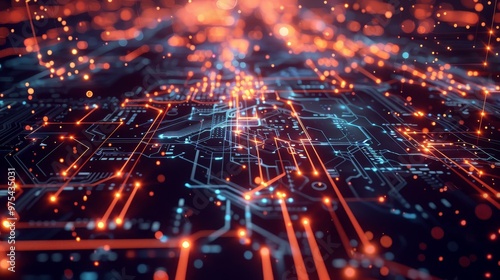 Fototapeta premium Abstract digital circuit design with glowing lines and particles in vibrant...