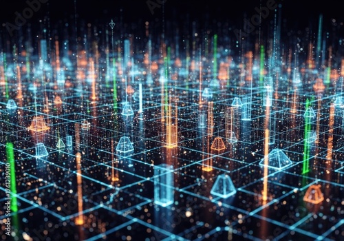 © Selda, Fototapeta premium Abstract digital city concept with glowing lines and geometric shapes