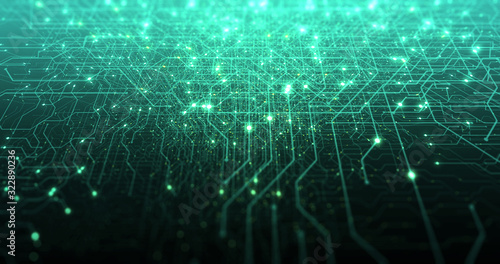 © Quardia Inc., Obraz premium Abstract digital city. Digital Circuit board, Motherboard, Digital chip. Digitalization of Information: IT, IOT, Server, Data Center. Animated Visualization of Network Data. 3D render