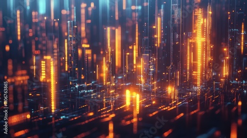 Fototapeta premium Abstract digital city with glowing orange lines and blue and purple lights.