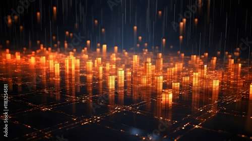 Fototapeta premium Abstract Digital Cityscape: Glowing Orange Towers and Data Streams