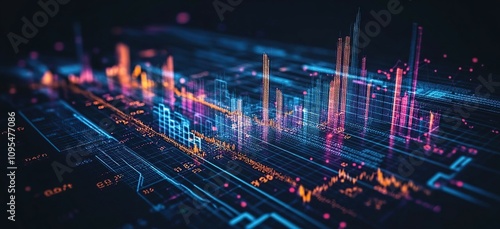 Naklejka premium Abstract digital cityscape, vibrant colors, data visualization, technological progress