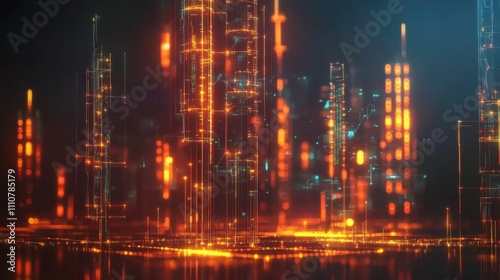 Naklejka premium Abstract Digital Cityscape with Glowing Orange and Blue Lights