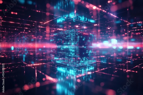 © HO, Obraz premium Abstract digital cube rotating, data grids and glowing edges