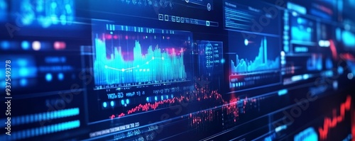 © Aris Suwanmalee, Obraz premium Abstract digital data display with blue and red glowing graphs.