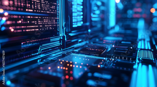 © Yohanes, Obraz premium Abstract Digital Data Network Glowing Blue Circuits and Binary Code