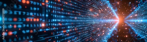 Naklejka premium Abstract Digital Data Stream Background with Binary Code and Light Effects, Futuristic Technology Concept, High-Speed Data Transfer, Cybersecurity, and Information Technology