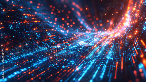 © Nur Rohman Rizki, Fototapeta premium Abstract Digital Data Stream Flowing Network of Blue and Orange Light Particles