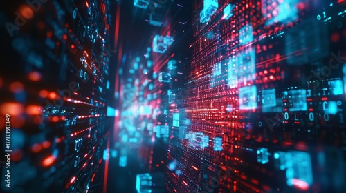 Obraz premium Abstract digital data stream with glowing blue and red squares, representing...