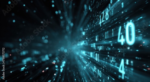 Fototapeta premium Abstract digital data stream with glowing cyan numbers moving fast.