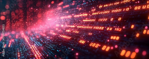 © Bussakon, Obraz premium Abstract digital data stream with glowing neon binary code on a futuristic interface background