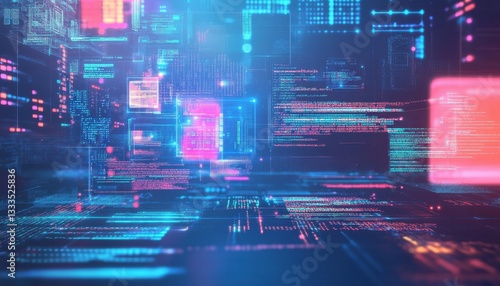 © Riz, Obraz premium Abstract Digital Data Stream with Glowing Neon Lines and Shapes