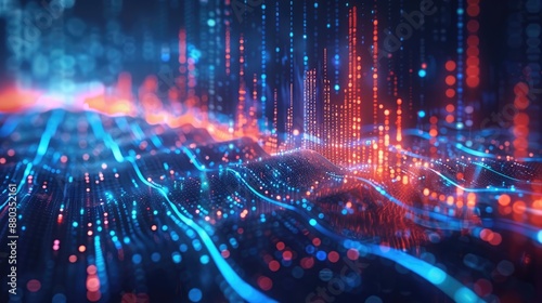 © Nuth, Obraz premium Abstract digital data visualization with futuristic neon lights and lines depicting technology, information flow, and analytics.